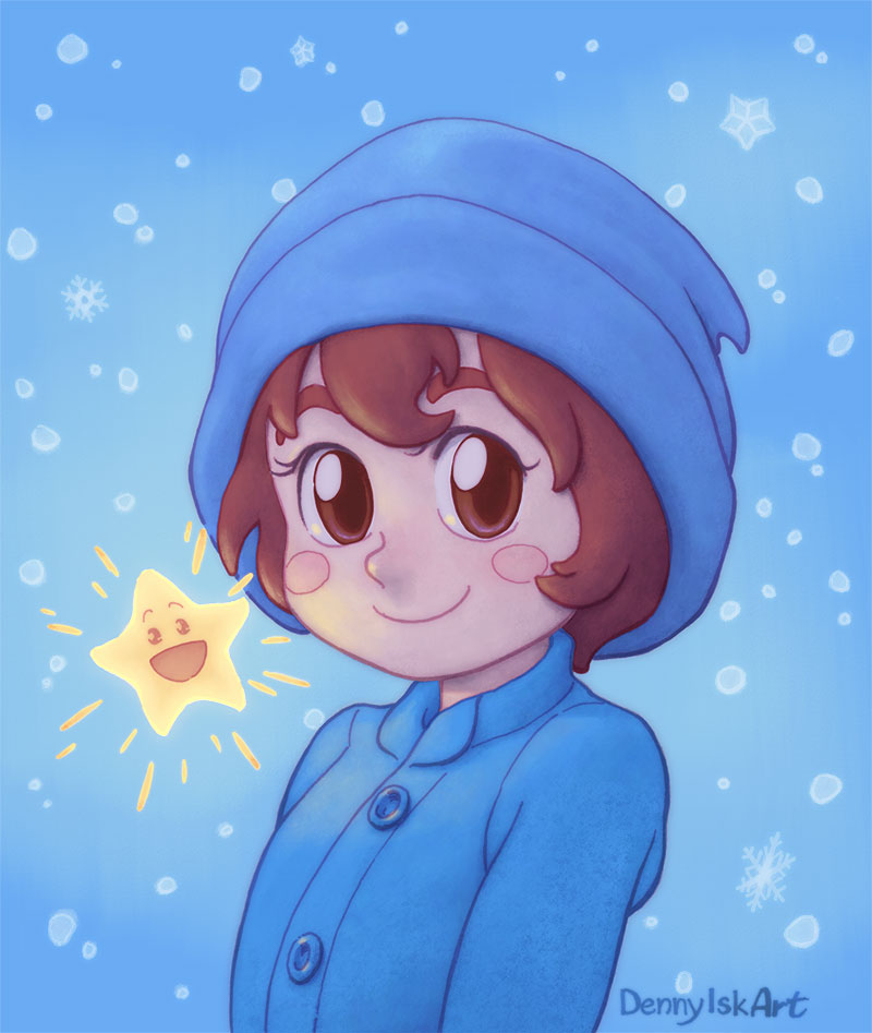 With the word "cold" in the title, I knew the background would be cool colors. The unusual choice was using blue for the girl's clothes as well. Applying warm(er) colors to her face and hair would then make them the focus. The warmest region is Little Star, casting extra warm light pass on the girl's face.